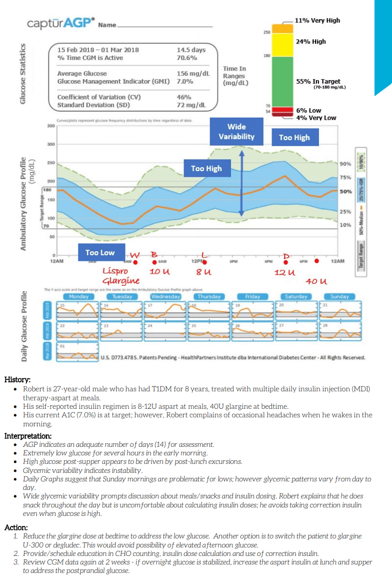 Device download reports vary by manufacturer and include differing data presentations; however, there has been a recent push to focus on use of the Ambulatory Glucose Profile (AGP) report, which was developed by the Park Nicollet International Diabetes Center (IDC) in Minneapolis, Minnesota27. The use of one report would aid in standardization of care and would help to make interpretation more accurate and efficient. The AGP report includes summary statistics, a glucose profile graph and an insulin profile graph or glucose daily calendar graphs.