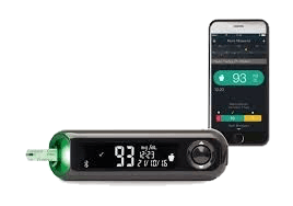 An easy to use smart meter and app system with Bluetooth technology and a colored light indicator that identifies if blood glucose readings are above, below or within target range. Second chance sampling available.