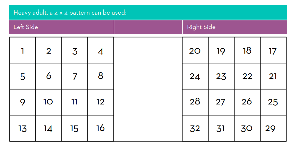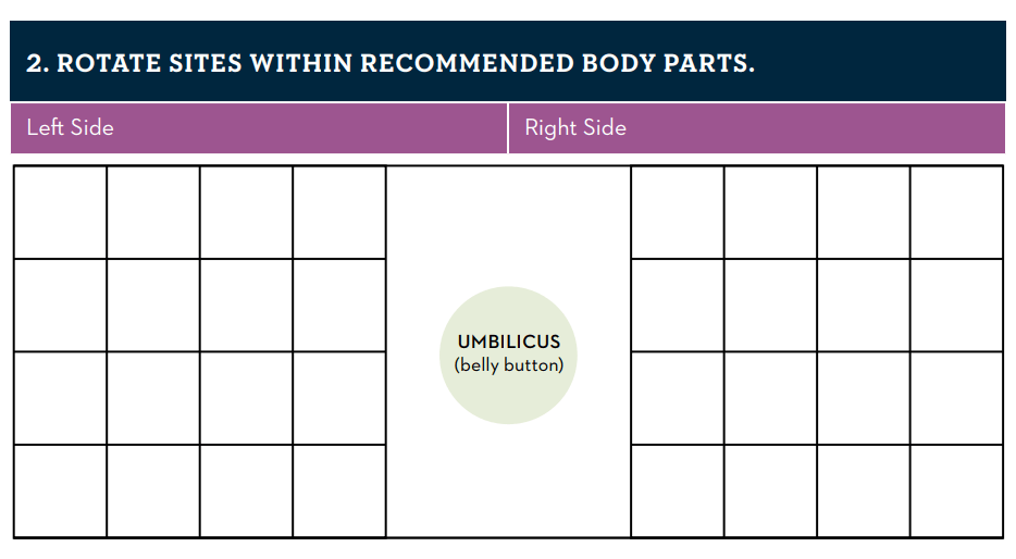 Rotating sites in an organized fashion is the best way to prevent site overuse. Simply going from right side to left side repeatedly may result in overuse of sites before they have a chance to fully heal. Instead, stay on one side of your body for several site changes, moving just a couple of inches each time – 2” minimum for angled infusion sets, 1” for 90-degree infusion sets. Keeping the old infusion set on the body can serve as a good reference point for placing the new infusion set. For example, when placing infusion sets on a large body part such as the abdomen of a heavy adult, a 4 x 4 pattern can be used:
