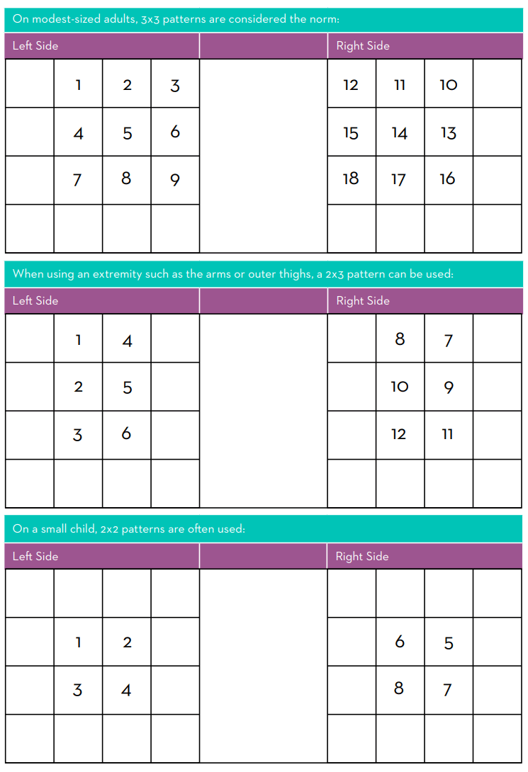 Once all sites on both sides of a body part have been used, the individual may repeat the process on the same body part or move to a different body part.