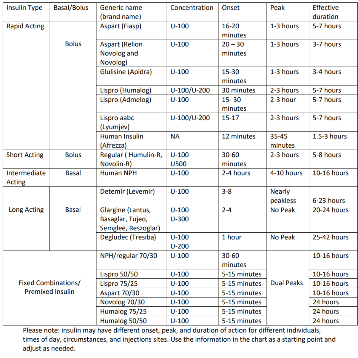 It is important to remember that a set it and forget it approach to insulin does not work for an individual on insulin therapy. It's necessary to continually evaluate a person’s insulin plan over time based on data on the effectiveness of their insulin plan. Using the published information on onset, peak and duration of action (see table above) is a useful starting point that will need to be adjusted based on the numerous factors that will continually impact the lives of people with diabetes.
