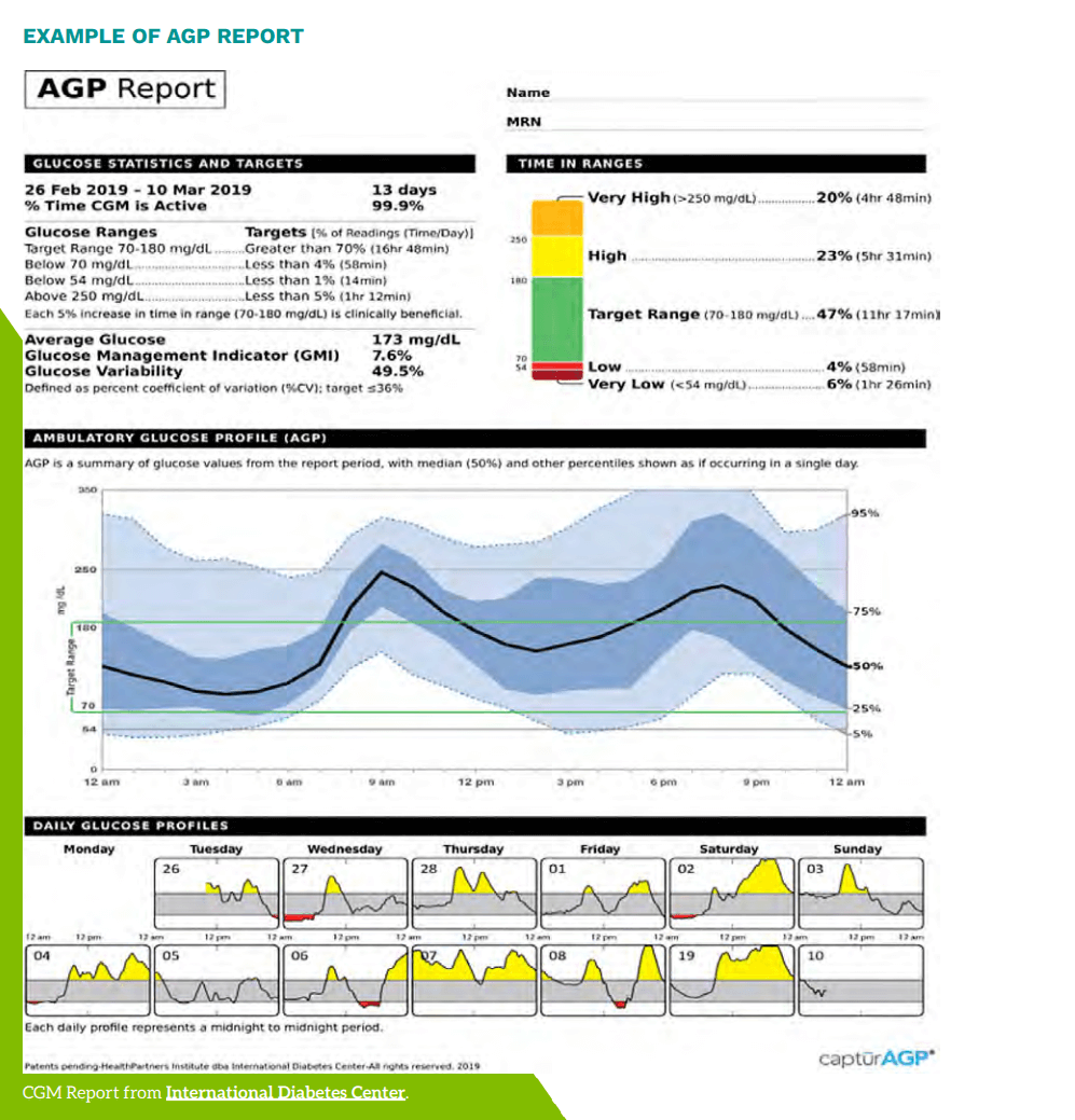 Device download reports vary by manufacturer and include differing data presentations; however, there has been a recent push to focus on use of the Ambulatory Glucose Profile (AGP) report, which was developed by the Park Nicollet International Diabetes Center (IDC) in Minneapolis, Minnesota27. The use of one report would aid in standardization of care and would help to make interpretation more accurate and efficient. The AGP report includes summary statistics, a glucose profile graph and an insulin profile graph or glucose daily calendar graphs.