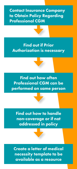 Defining the billing process before you begin will help ensure that all potential roadblocks are anticipated, identified and addressed. Make a list of the common insurance payors that your patients may have. Investigate what their policies are surrounding Professional CGM use. Educate staff on the billing codes to utilize for Professional CGM.
