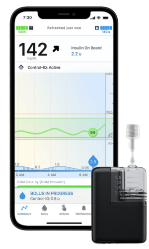 Tandem Mobi Mini insulin pump with Control-IQ technology is an advanced hybrid closed-loop system that uses an algorithm to automatically adjust insulin delivery in response to glucose levels. Similar to the Tandem Control IQ, the system predicts glucose values 30 minutes ahead, based on CGM readings, and can decrease or stop basal insulin delivery to help prevent lows, or increase basal insulin delivery and deliver correction boluses to help avoid highs.