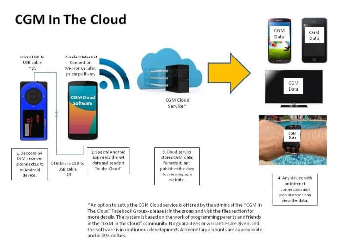 Smartphone: a phone that can be connected to the internet and can run applications (apps) that perform various functions. For the NightScout software the smartphone is attached to the Dexcom receiver to transmit data to the cloud. Transmitting data is the phone’s only purpose. As of this date (July 18, 2014) only phones/devices that use the Android operating system are able to transmit Dexcom data to the cloud. Development is in progress to be able to send data via iOS. Any smartphone or device (iPhone, tablet, iPad, kindle, PC, iMac, etc.) that can access the internet to see webpages can access and view the CGM data of the person you are following.